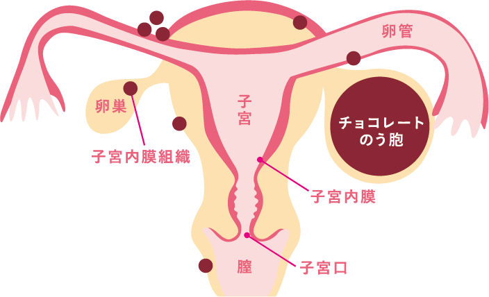 子宮内膜は女性ホルモンの影響で月経周期に合わせて増殖しますが、子宮以外にできると経血がうまく排出できずに溜まったり、周囲の組織と癒着を起こすことがあります。卵巣にできる「チョコレートのう胞」は、放置するとまれに卵巣がんに進行する可能性もあるため注意が必要です。