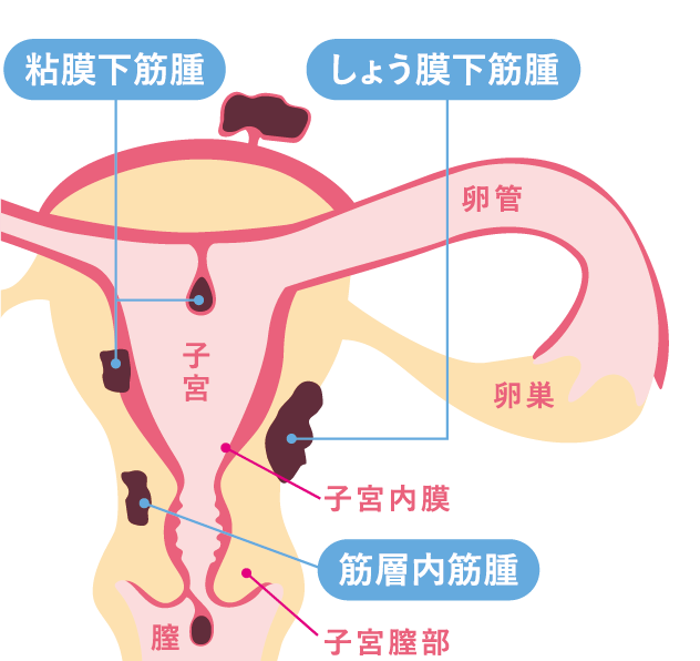 子宮筋腫は、子宮にできるコブのような良性腫瘍で、30〜40代の女性に多く見られます。筋腫の種類は、粘膜下筋腫(不正出血や不妊の原因になる)、漿膜下筋腫(大きくなるまで自覚症状が出にくい)、筋層内筋腫(大きくなると不正出血や流産・早産の原因になる)があります。卵巣から分泌される女性ホルモンによって成長し、閉経に近づくと発育が止まります。
