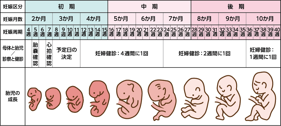 妊娠週数は、最後の月経開始日を妊娠0週0日として数えます。例として28日周期の場合、排卵日は妊娠2週0日、分娩予定日は280日目(妊娠40週0日)となります。